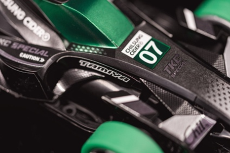 우선 이번 프로젝트에서 홍보하려는 음료가 ‘칠성사이다 제로’였어요. 칠성사이다 제로의 메인 색상인 블랙과 그린, 그리고 사이다 탄산의 반짝거리는 느낌을 실버로 표현하면서 키 컬러로 잡았는데요. ‘Project Chil*’의 로고와 심볼을 활용해 실제 레이싱카들의 리버리(다양한 스폰서 로고들로 가득한 차량 외관)와 같이 표현하는 것을 메인 콘셉트로 삼았습니다. 실제 F1 머신 같은 느낌을 강조한 거죠. 해당 제품은 칠성사이다의 이미지를 강조하면서 기존의 미니카 유저들에게 성능 면에서도 일반 기본 키트와는 다른 상향 부품을 추가하는 것을 목표로 제작했어요. 이를 위해 타이어 재질을 카본으로 변경하고 칠성사이다의 그린 컬러를 적용했습니다. 레이스에서도 바로 활용될 수 있는 한 단계 높은 아토믹튠 모터를 추가했고요. 칠성사이다 전용 디자인의 모터 라벨도 붙였는데, 미니카 디자인 자체에 한글이 포함된 만큼 국내 타미야 팬 분들 사이에서 반응이 굉장히 좋았어요.